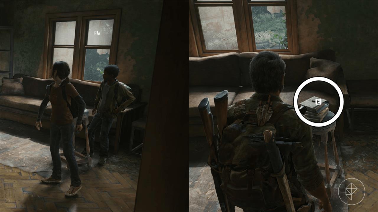 Head back down to the first floor to find Ellie and Sam playing a game of darts. Wait for them to finish then move to the pile of books stacked on top of a stool. Interact with the dart to start an optional conversation.