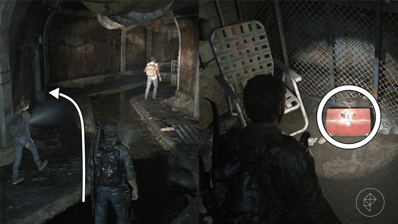“The Sewers” starts when you’re washed ashore and reunited with Henry and Sam. This section ends after Joel and Henry block the door with a vending machine.