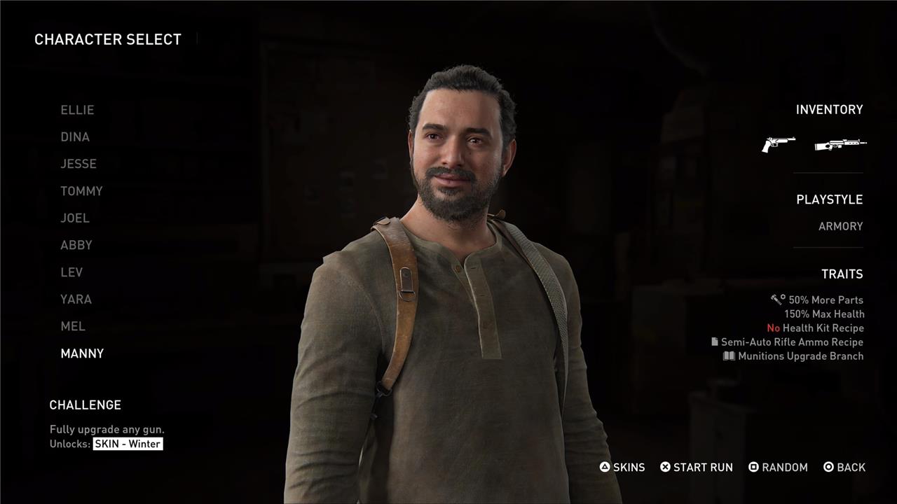 Manny is the final character you can unlock in Abby’s path in The Last of Us Part 2’s No Return roguelike mode. To unlock Manny, you must first complete three encounters as Yara to unlock Mel, then finish four encounters as Mel. Once unlocked, Manny stands out for his durability and resourcefulness: he starts each run with a semi-auto rifle and a hunting pistol, boasts 150% max health, and gains 50% more parts from encounters-making him ideal for players who want a tank-like character with plenty of upgrade potential. However, Manny cannot craft health kits, a unique drawback that requires players to rely on health kit purchases from trading posts instead. His upgrade path, the Munitions branch, enhances his ammunition crafting abilities, especially for his signature weapons.