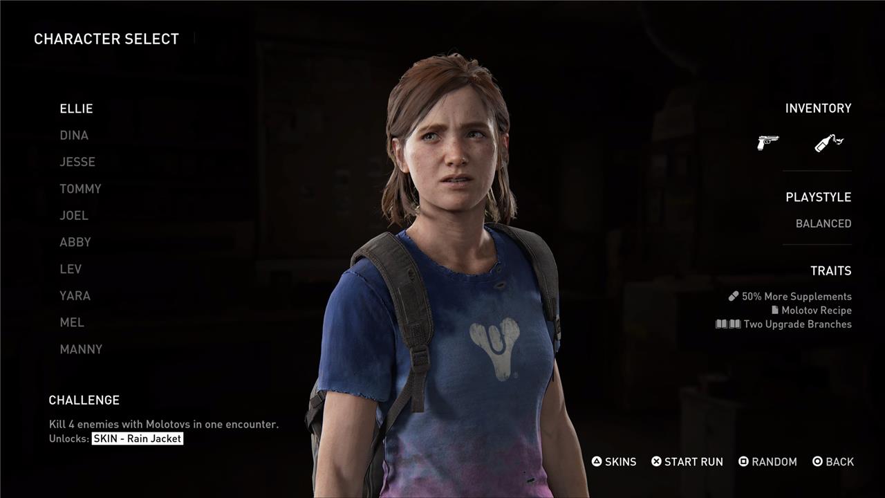 Ellie is the only character with the “balanced” playstyle, and there’s a reason for that. She’s just Ellie from The Last of Us Part 2, and she doesn’t have any special tools to help her succeed. She does, however, offer a very balanced game. Starting with a Molotov cocktail can really help you out of a bind – especially against some early Infected rounds. And getting double Supplements means you can upgrade a ton of different skills as you progress toward the boss round.