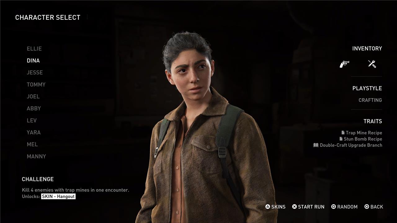 Dina is the first unlockable character on Ellie’s path in The Last of Us Part 2’s No Return roguelike mode. To unlock her, you simply need to complete two encounters while playing as Ellie. Once unlocked, Dina brings a crafting-focused playstyle to your runs, starting with a revolver, trap mines, and stun bombs in her inventory. Her unique traits include access to the Trap Mine and Stun Bomb recipes, as well as the Double-Craft upgrade branch, which enhances her ability to craft multiple items efficiently. This makes Dina especially effective for players who prefer using crafted explosives and maximizing resource output during encounters.