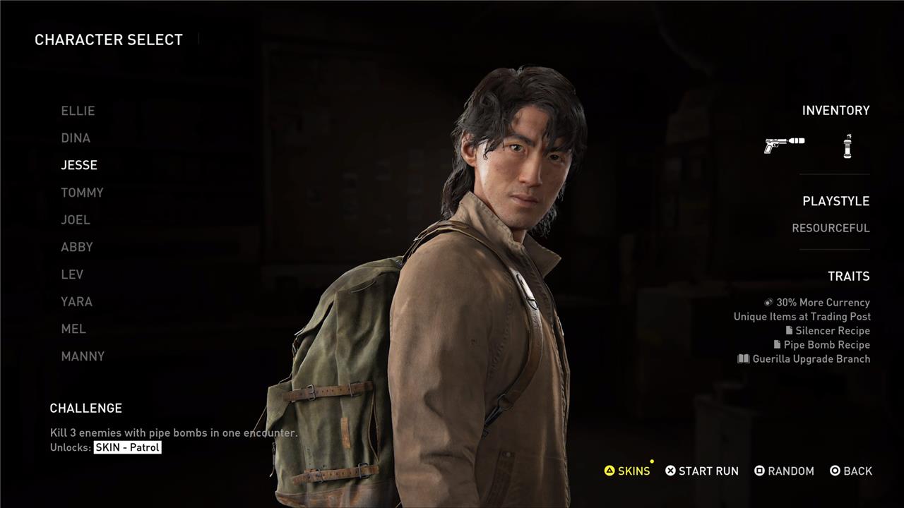 Jesse starts each run with a silenced pistol and pipe bomb, and he has recipes to craft more of both items. His playstyle is resourceful, benefiting from earning 30% more currency after each encounter, which allows him to purchase more and unique items from the Trading Post. Jesse also features a Guerilla upgrade branch, enhancing his adaptability and effectiveness in combat.