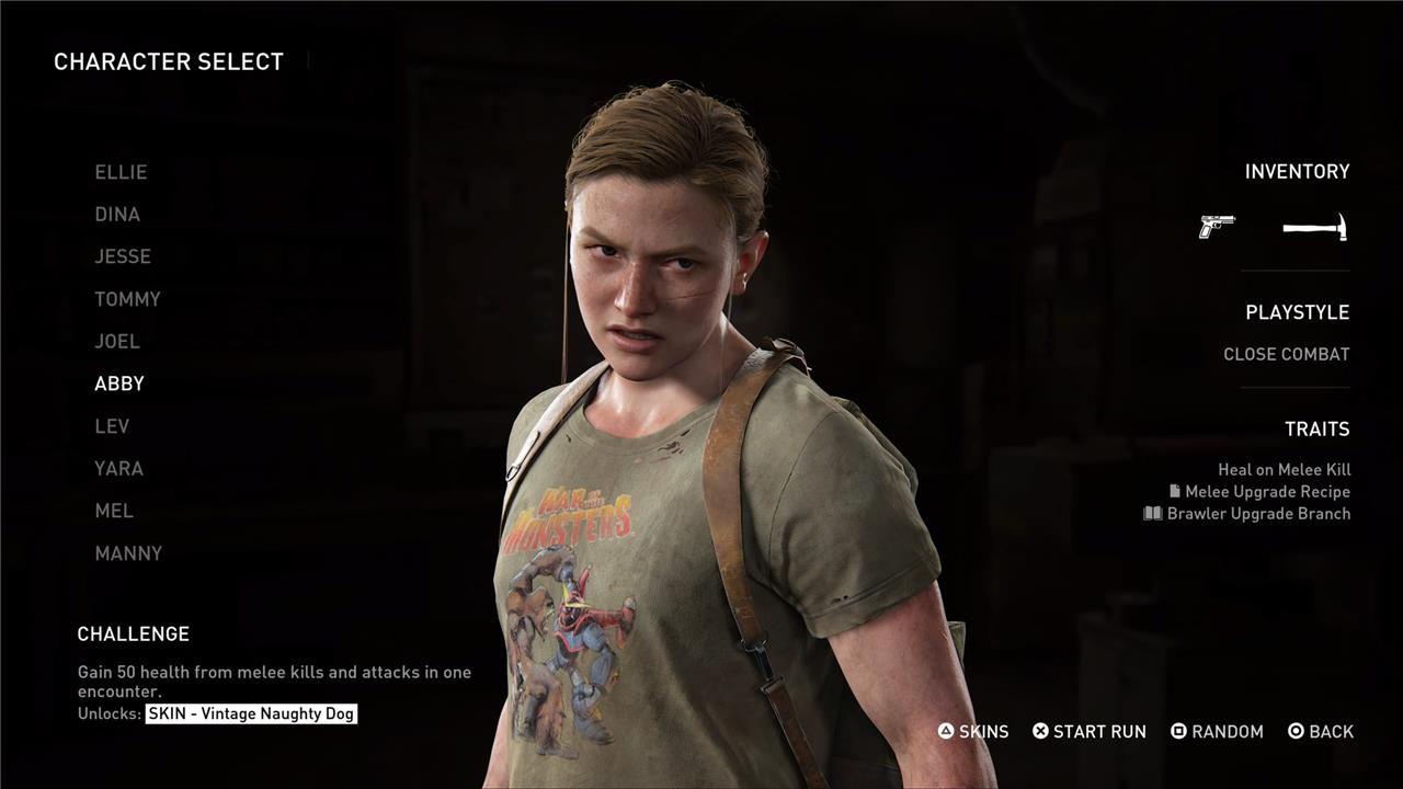 Abby is available as a playable character in The Last of Us Part 2’s No Return roguelike mode right from the start-no challenges or encounters need to be completed to unlock her. Abby’s playstyle focuses on close combat, making her a formidable choice for players who prefer aggressive, melee-oriented tactics. Her unique traits include healing upon melee kills, access to a melee upgrade recipe, and a dedicated Brawler upgrade branch, which enhance her survivability and effectiveness in hand-to-hand encounters. Abby begins each run equipped with a pistol and her signature hammer, reinforcing her role as a powerful frontline fighter in No Return.