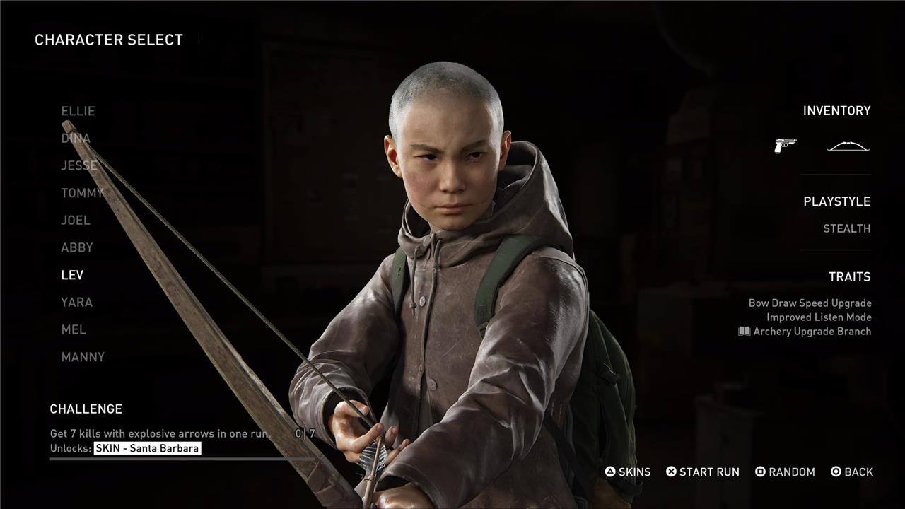 Lev is unlocked in The Last of Us Part 2’s No Return mode by completing two encounters while playing as Abby. Once unlocked, Lev stands out as the game’s premier stealth character, starting each run with a bow-enhanced by a draw speed upgrade-and an improved listen mode for better enemy detection. Lev’s unique archery upgrade branch allows for further bow enhancements, including crafting more arrows and powerful explosive arrows as you progress. This toolkit and playstyle make Lev exceptionally suited for silent, long-range takedowns and navigating encounters without alerting enemies.