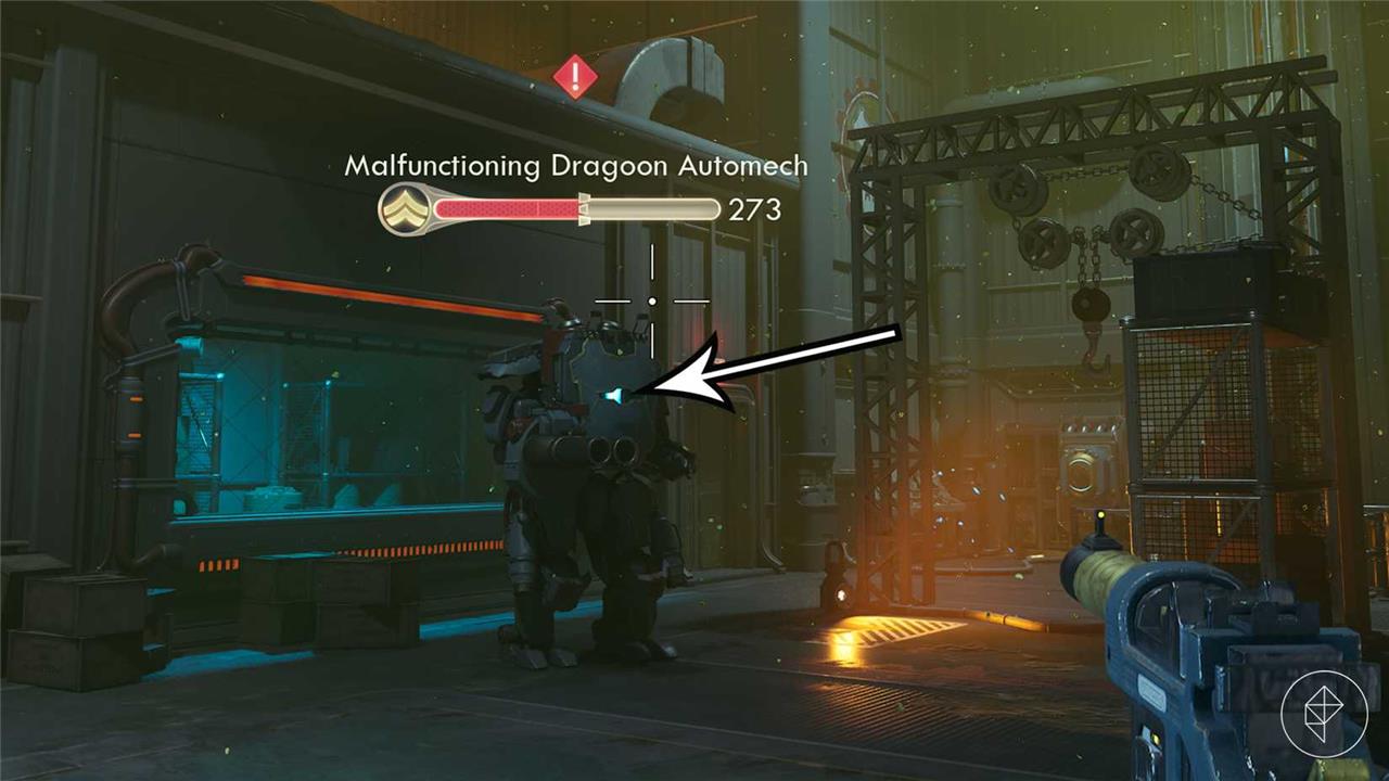 Carefully observe mech-type enemies and try to spot glowing parts; these are their weak points. In the case of this burly automech, for example, the weak point is the blue glowing core:
