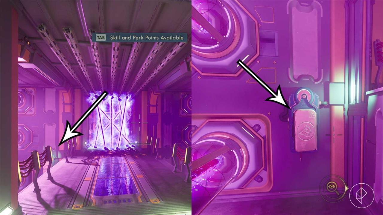 This requires Hacking level 3. To use this method, equip the N-Ray Scanner and carefully drop down the ledge on the left. There’sa tripwire between your landing position and the circuit on the wall, so either disarm the trap (requires Explosives level 5) or jump across.