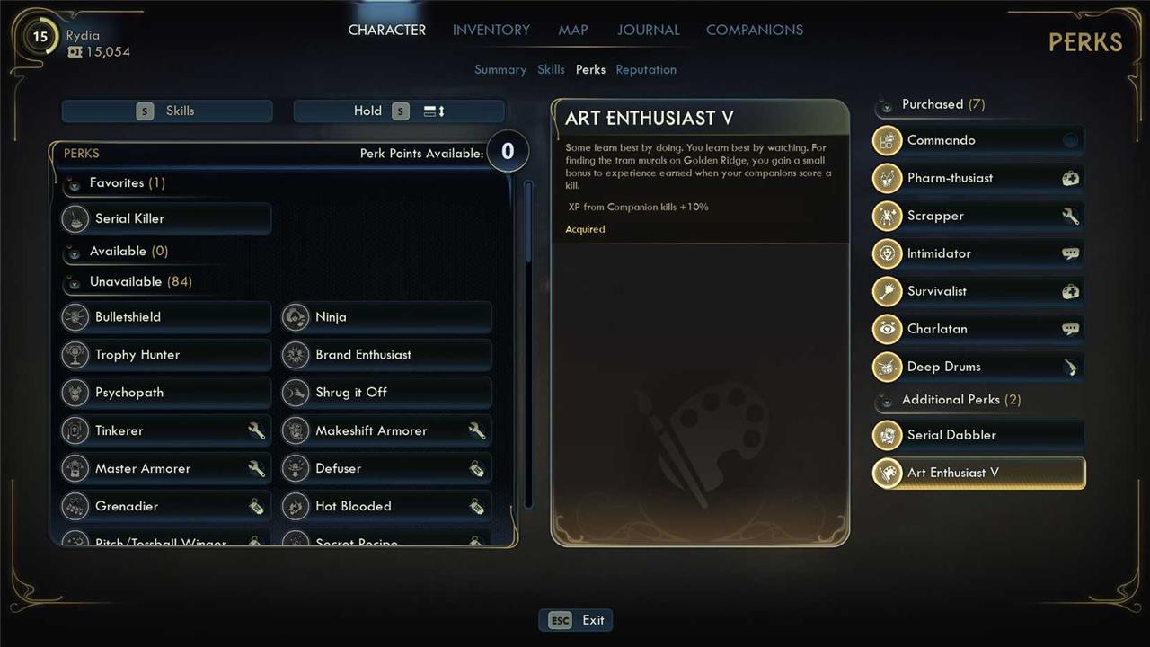 This perk is automatically added to your character when you get the first piece. It gives you 2% of experience points from companions kills per mural piece. The perk evolves from Art Enthusiast up until Art Enthusiast V if you have every pieces. In other words, you don’t need to finish the quest to receive the perk, but if you do, it will give you 10% experience, which is a great bonus!