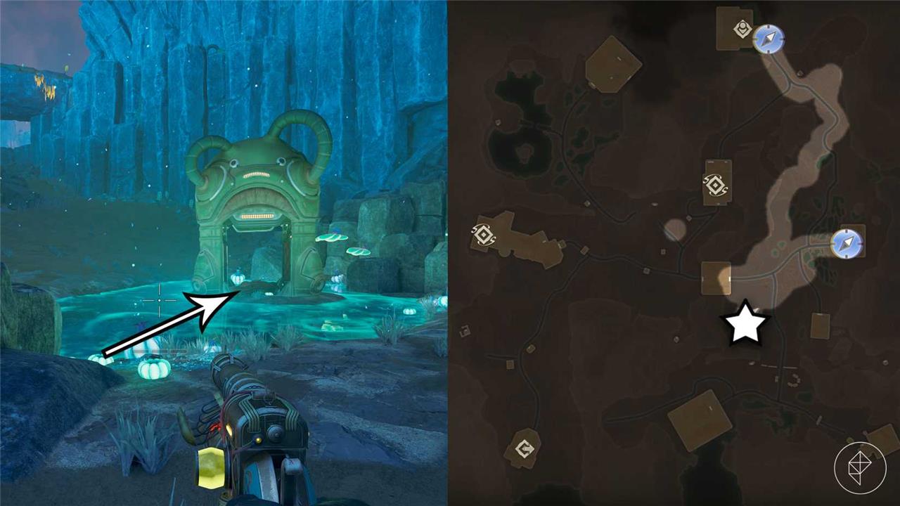 On The Cloister’s east coast, you’ll find the Excogitation Chapel. Pass this area on the north side, then follow the coastline until you see a large, roundish cave opening with the Frightened Ursopod Cub inside.