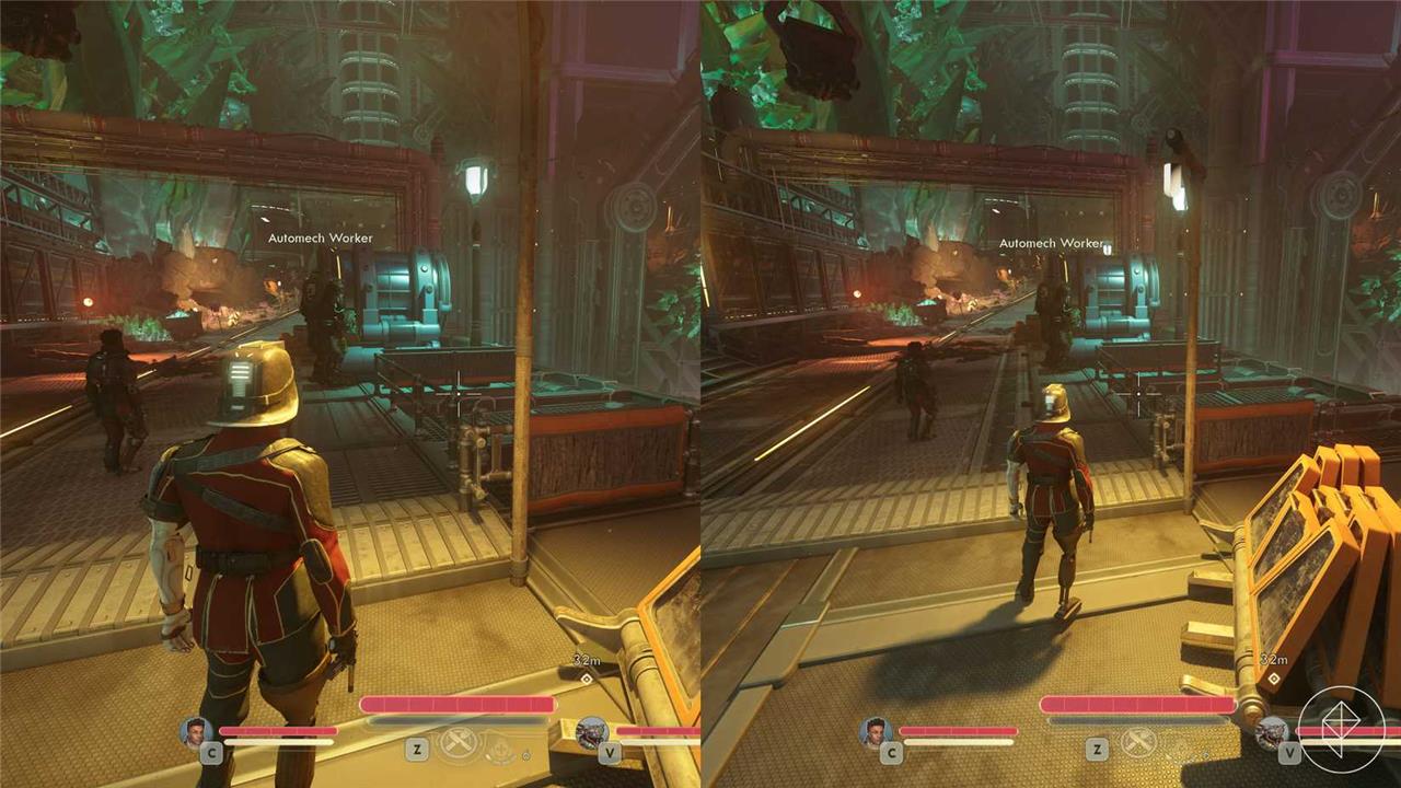 You can also switch between the default and the alternate shoulder. As you may have noticed in the example above, the third-person camera in The Outer Worlds 2 is never positioned directly behind your character, but always a bit to the left (so it doesn’t interfere with the visor at the center of the screen). By swapping to the alternate shoulder, you can position the camera on the right side of the character instead. This may be especially useful if you’re left-handed.