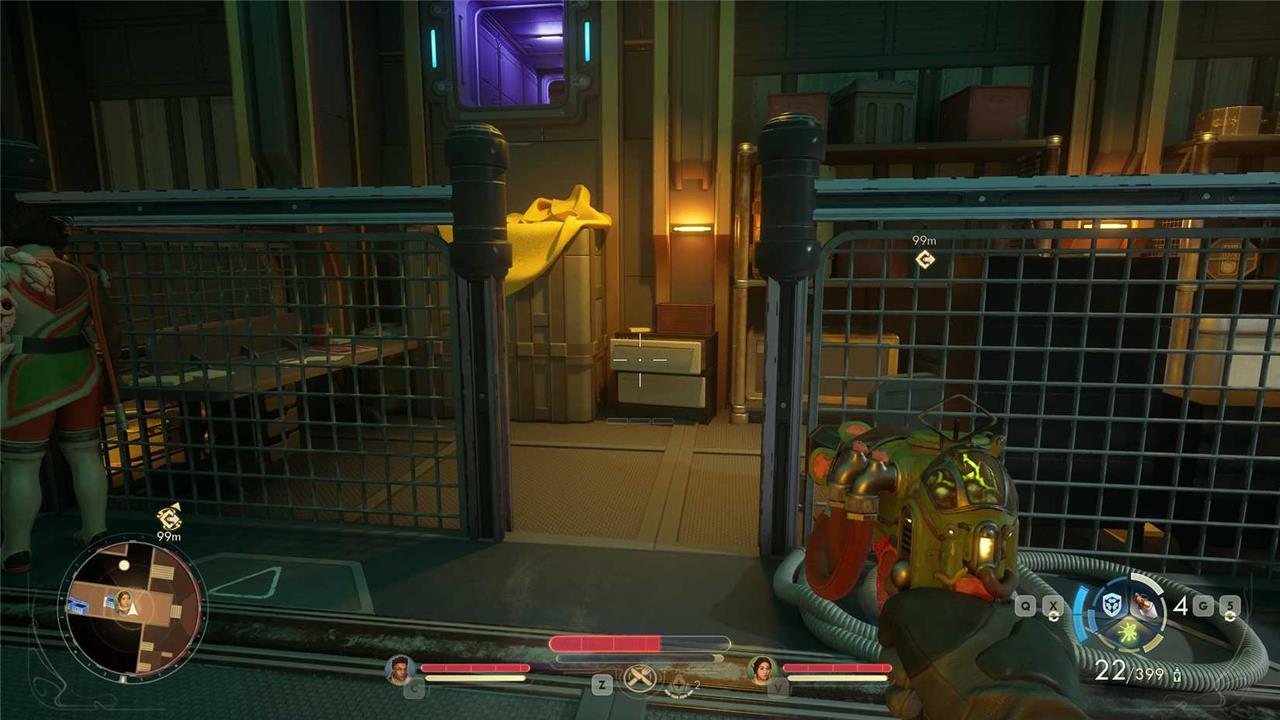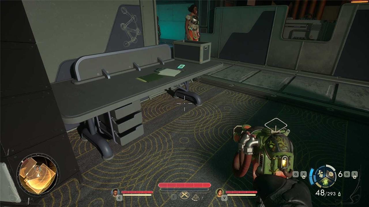 The elevator lets you out in a hallway with two rooms, one in front of you and one to the right, along with an Autodoc station and a vending machine. If you want to resolve the Montelli situation peacefully and are working with Corbin, enter the room to your right and interact with Montelli’s terminal before heading in to face the commander. If you don’t want to resolve things peacefully, get ready for a fight (and consider modding your armor to reduce shock damage).