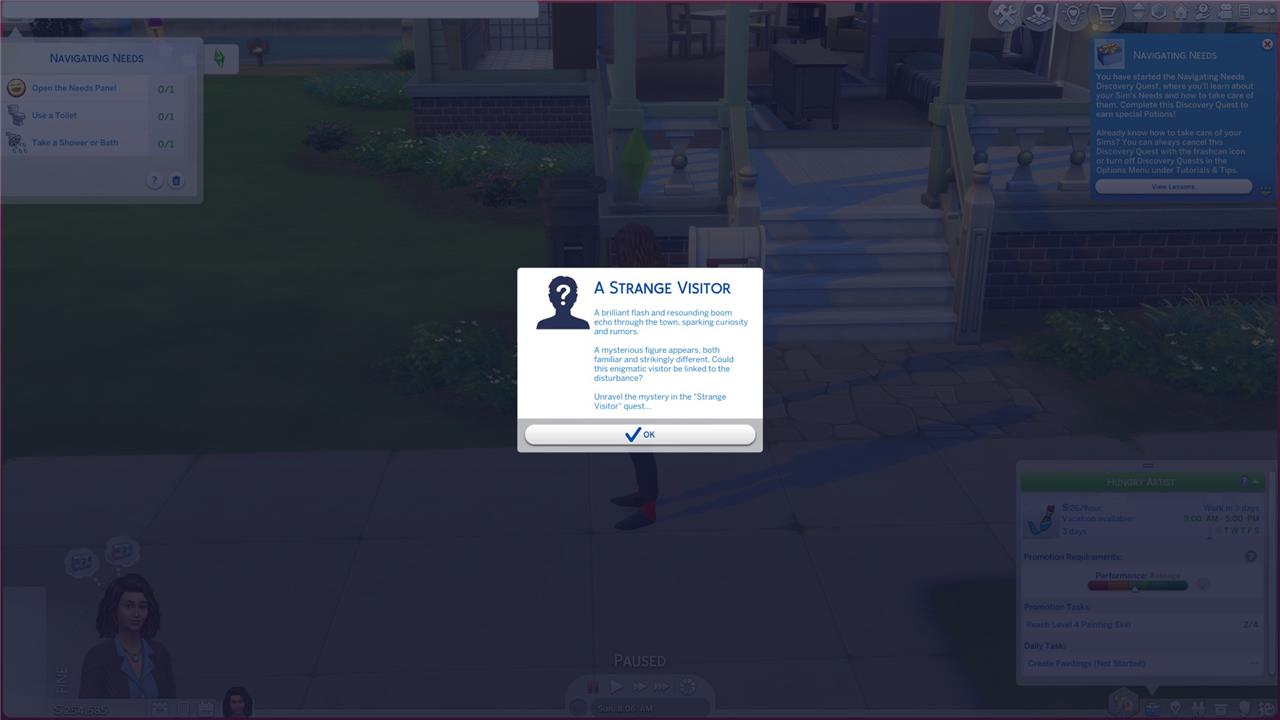 The first quest in The Sims 4 “Blast from the Past” event is called “A Strange Visitor.” To start it, load up any save on The Sims 4, enter live mode, and wait a bit. A window will automatically appear with the title “A Strange Visitor.” Click the “OK” button on the pop-up window and the quest will begin.