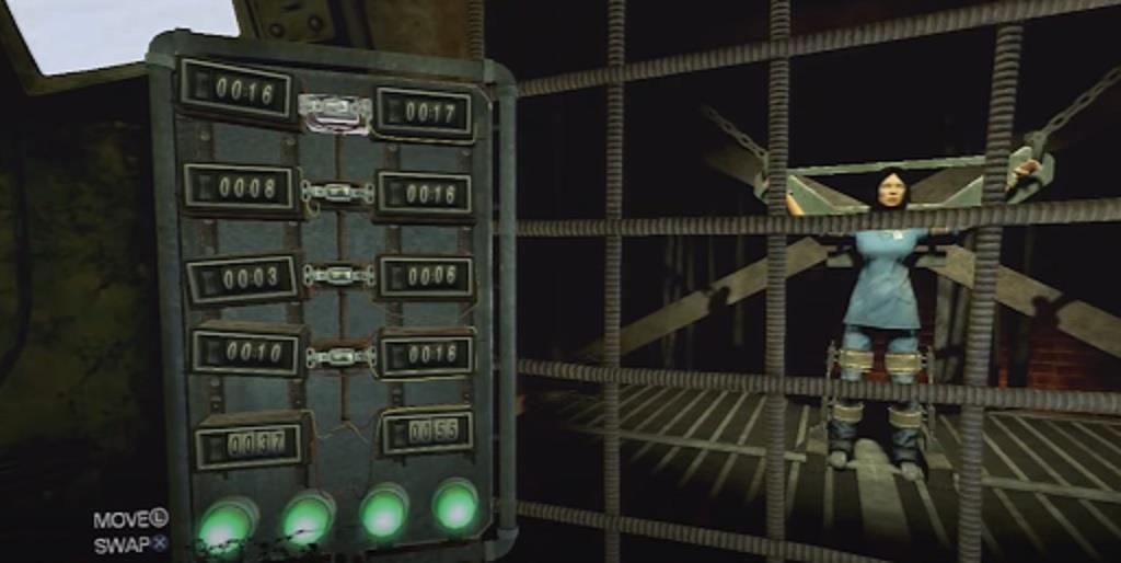 The most bizarre trap involves a woman, shackled in an elevator shaft, who risks being torn in half by the descending elevator. Like all of the traps in this series, you try to save her, minigame style. It’s like Mario Party if you constantly hear shouts of “I DON’T WANNA DIE!” in the background, and failing to provide the right series of combinations here will see the woman bisected at the waist. Your treat for losing? The Jigsaw puppet laughs at you.