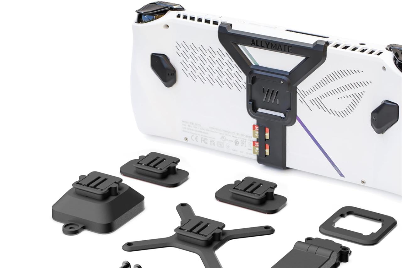 The Allymate is a versatile accessory that functions as a kickstand, wall mount, and VESA mount, and provides slots for SD cards and battery packs.