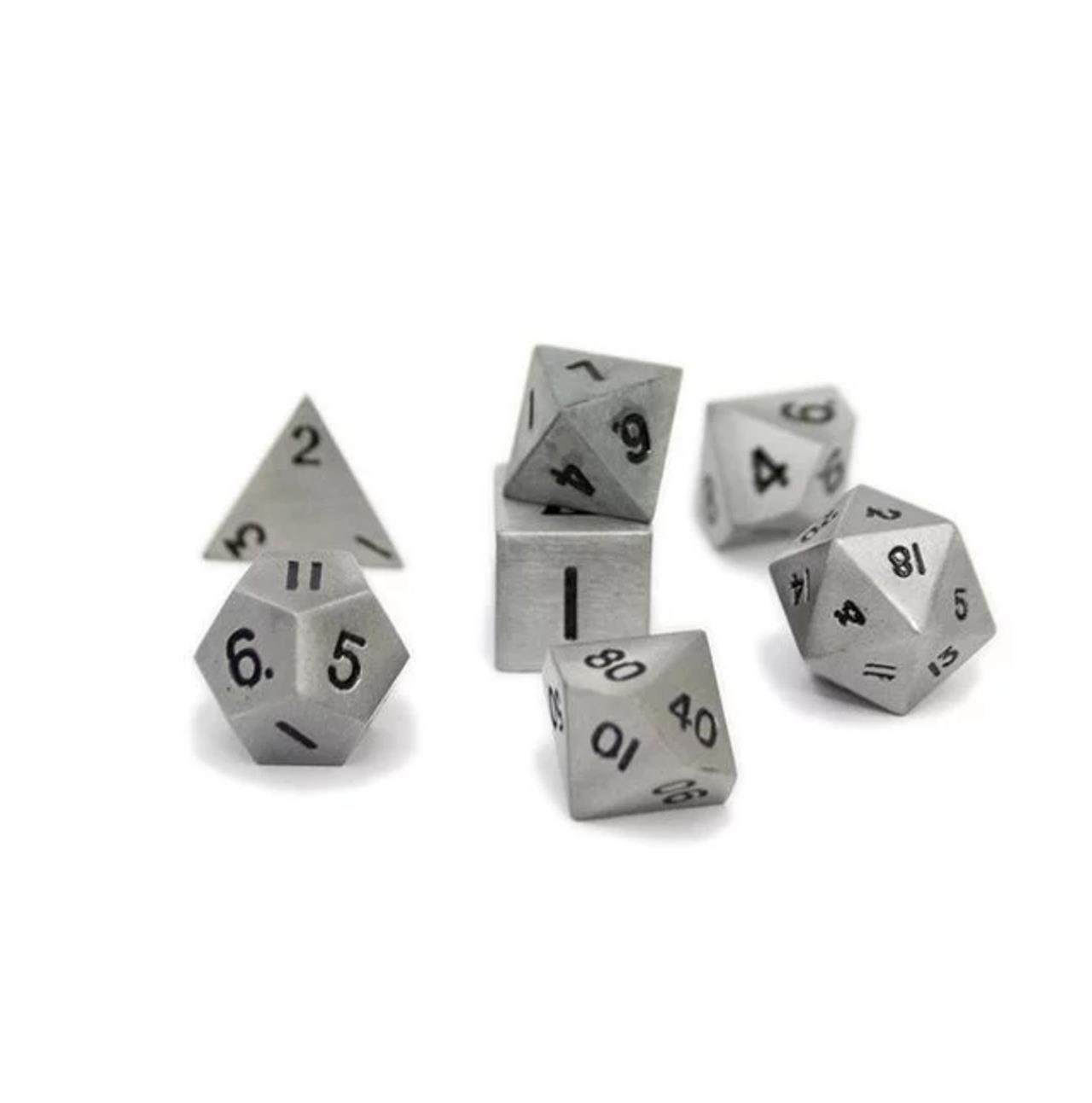 Metal Dice Sets: High-quality metal dice, such as those from Skullsplitter Dice, provide a satisfying heft and premium feel, often with striking color contrasts like black with red numbers.