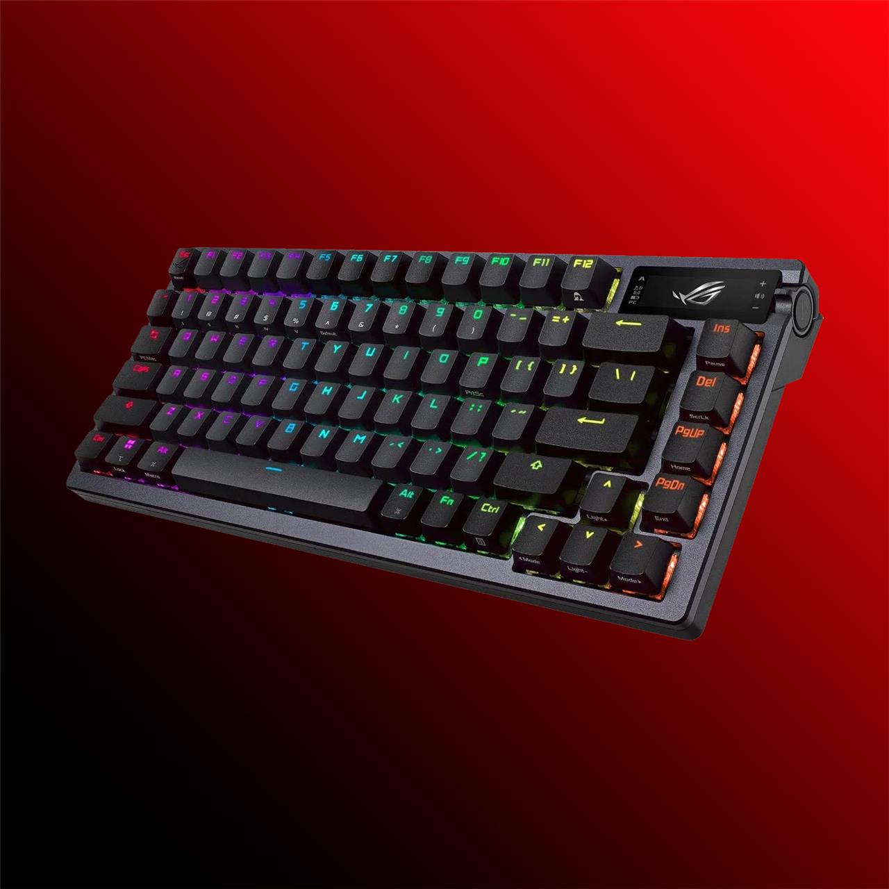 The ROG Azoth can work plugged in via USB-C, or wirelessly over Bluetooth or paired with the included 2.4 GHz wireless dongle. One of the keyboard’s most notable external features is the miniature OLED screen built into the top right corner. By default, the screen is programmed to show animated GIFs, but it can also display system metrics and custom images. It’s mostly cosmetic, but it’s useful to have in some cases, like to show a low battery warning.