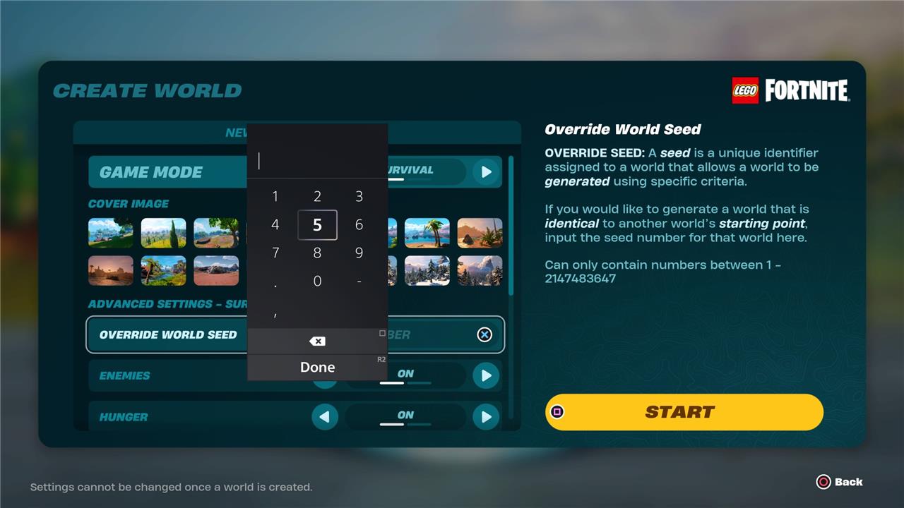 Additionally, you can manually set a seed combination when you’re first establishing your own map. When creating a map from the Lego Fortnite home screen, click on the option to “override” the world seed, and you can enter any combination of numbers you want, as long as that number hasn’t previously been taken by another user.