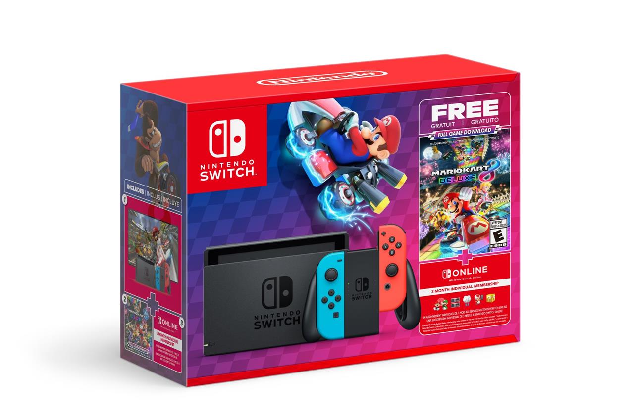 This bundle includes a Nintendo Switch with Mario Kart 8 Deluxe and a free three-month trial for Nintendo Switch Online.