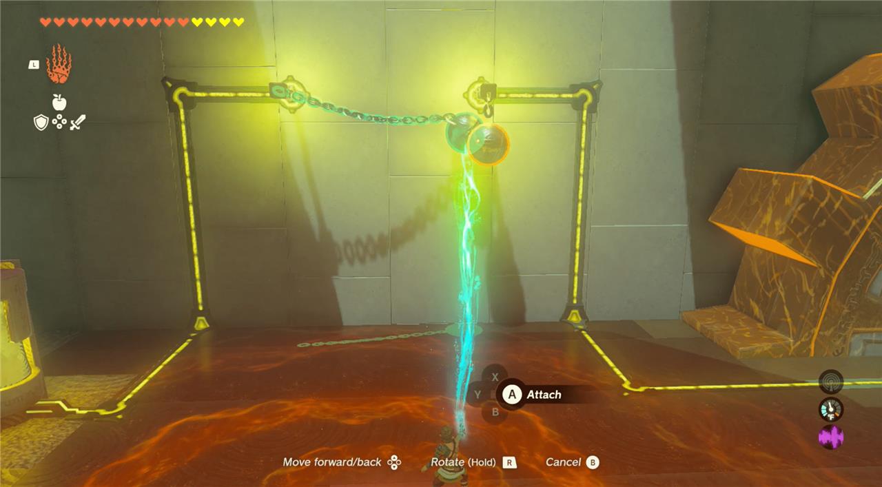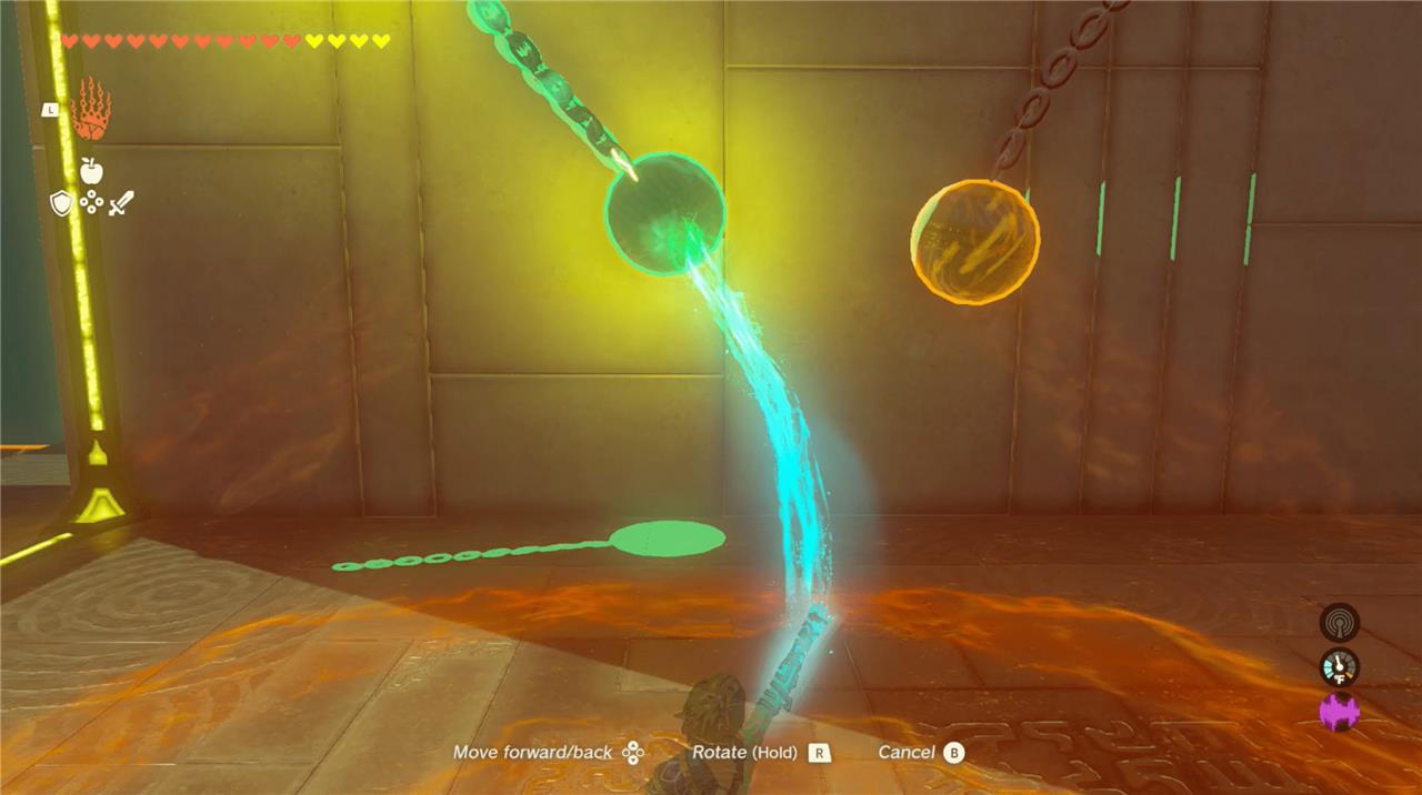 9. Walk the removed pillar over to the hanging ball in the room. Using Ultrahand, lay the pillar on top of the two jutting pillars to complete the flow of electricity.