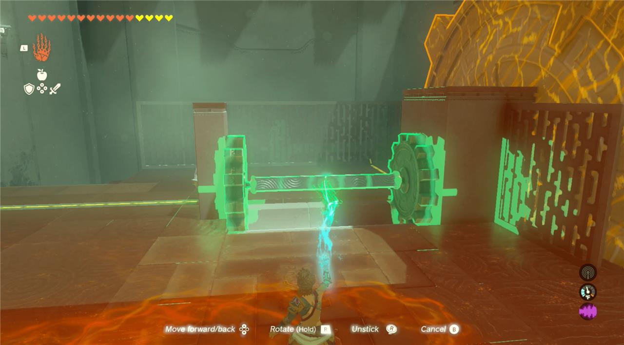 8. Jump back down. There are two smaller cogs connected by a long pillar. Use Ultrahand to remove the pillar between them.