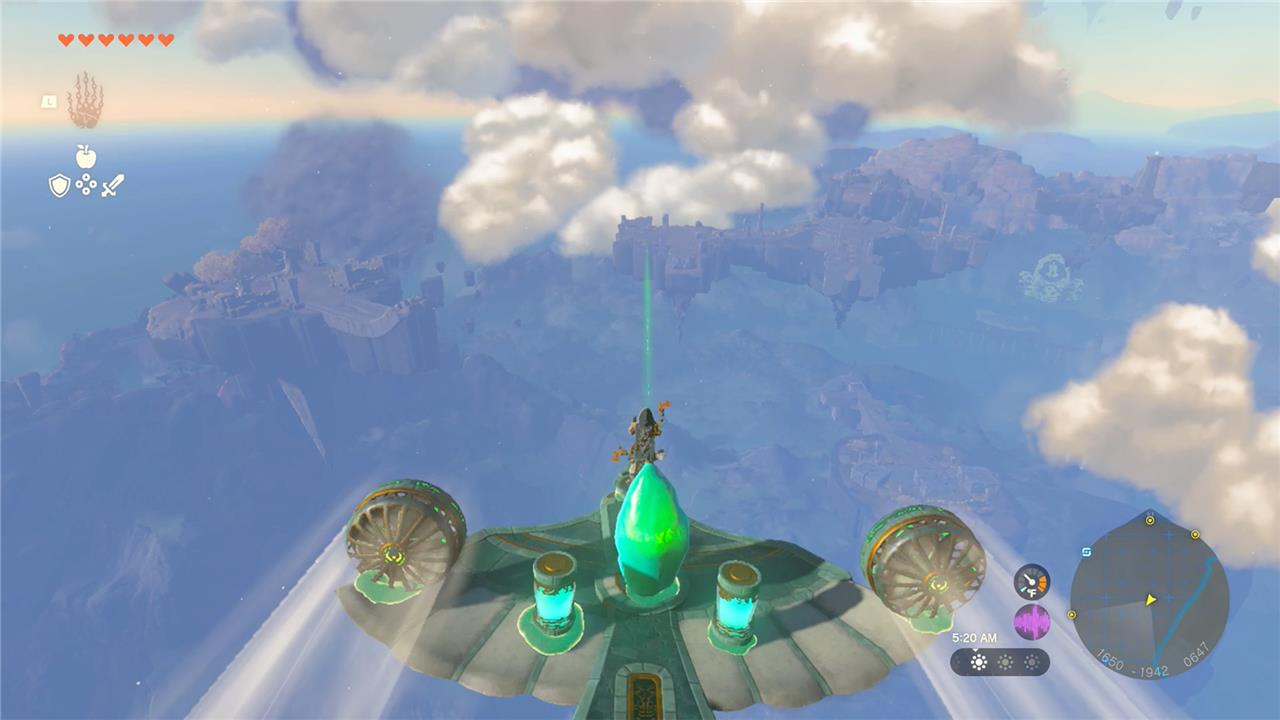 Launch from Sahasra Slope Skyview Tower (west of Kakariko Village, around 1673, -1895, 0650) and glide southeast toward the West Necluda Sky Archipelago above Dueling Peaks.โ