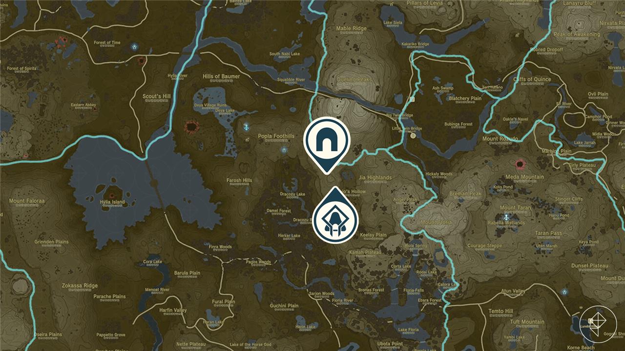 Head southeast from Popla Foothills Skyview Tower toward Tobio’s Hollow; glide or climb to the cave on the hill overlooking the area, northeast of Dracozu Lake. Interactive maps place it between Dracozu Lake and Tobio’s Hollow peaks.โโ