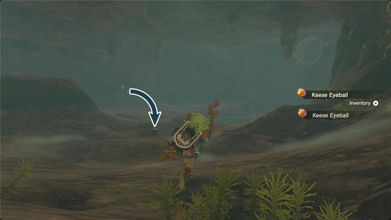 Enter the cave, defeat Keese near the entrance to collect wings if needed, and proceed through the tunnel past any Electric Chuchu. At the end, locate the abandoned campsite by a pond with a tattered notebook-examine it to officially start the quest, which provides the clue: “Throw the Zonai spear with a wing from the pedestal through the ring.”โ