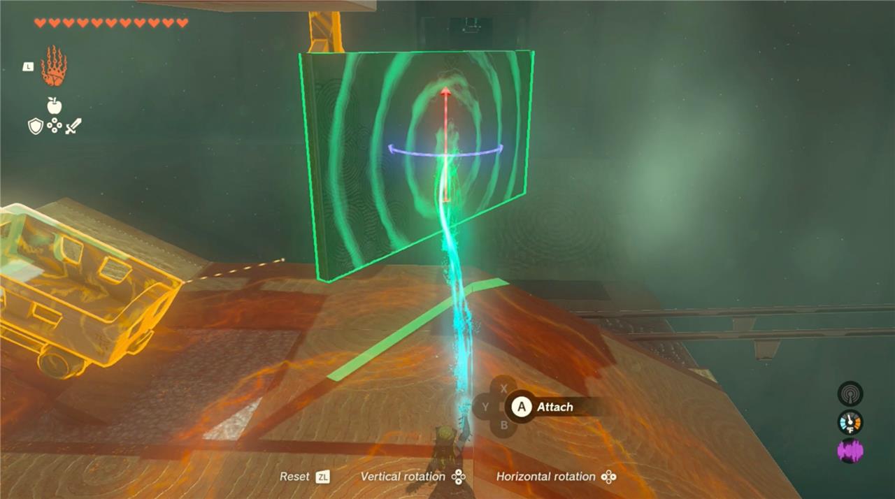 13. After changing up the slapper, jump in the cart, then use Ultrahand to lift up the metal and position it for a hardy swing. But get ready: you’ll want to be quick in the next part.