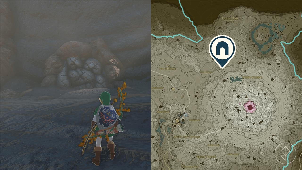 Lizard’s Burrow sits in Eldin Canyon between two lizard-shaped lakes north of Death Mountain, with its blocked entrance at coordinates 2203, 3077, 0406. Clear the boulders sealing the cave mouth using bombs or a hammer, then follow the path inside past hot spring water to a chest holding the Vah Rudania Divine Helm at 2282, 2991, 0407. Fast travel to Sibajitak Shrine and head northwest, or glide from Death Mountain’s caldera after launching from Ulri Mountain Skyview Tower.โ