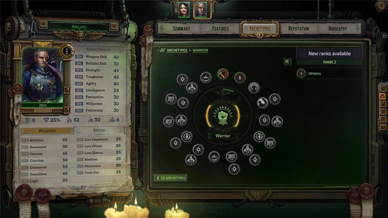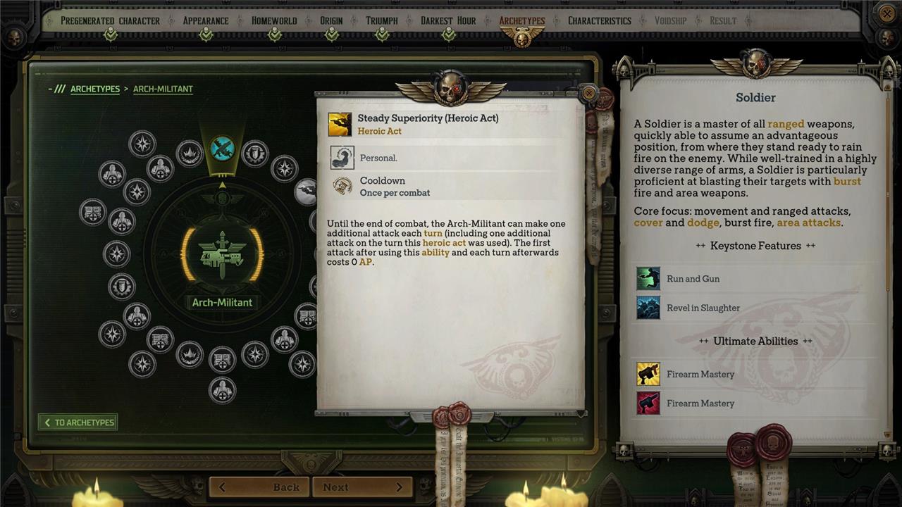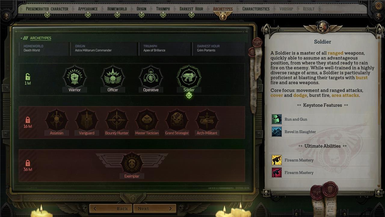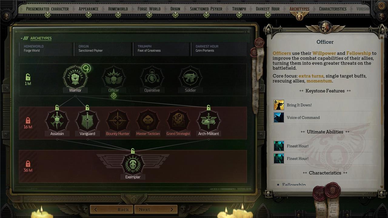 Archetypes are the Warhammer 40k: Rogue Trader equivalent of classes that we usually see in traditional RPGs. At level one, you can pick one from the four initial options: Warrior, Officer, Operative, and Soldier.