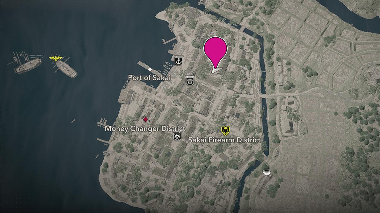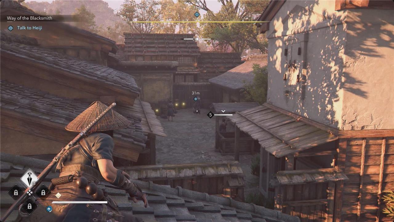 Heiji can be found east of the Port of Sakai in the Sakai area, located in the southwestern part of the Izumi Settsu region in Assassin’s Creed Shadows. To locate him, head to the rooftops east of the port and look for a small courtyard where Heiji is being harassed by a group of enemies. Using the zoom or focus function (L2/LT on controllers) will reveal a blue dot marking his position during the “Way of the Blacksmith” quest. Players can approach stealthily or engage in combat to rescue him. Once recruited, Heiji allows you to upgrade weapons and armor and unlocks the forge in your hideout.