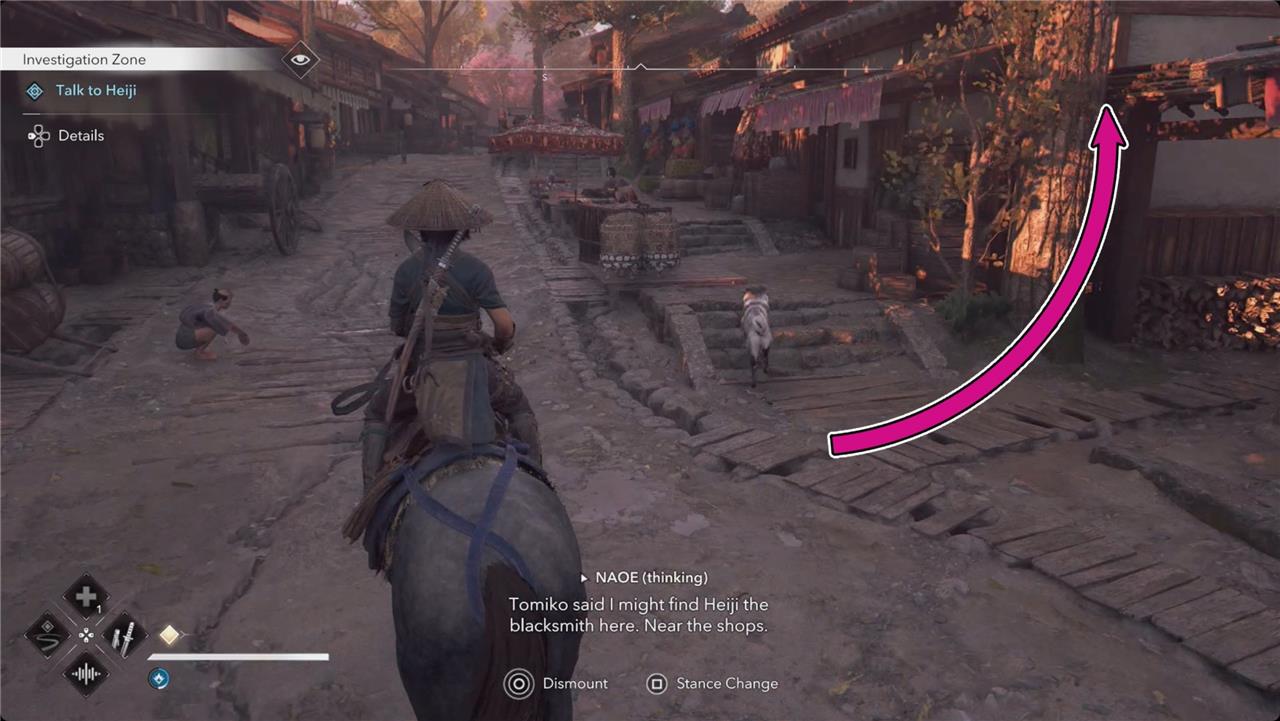 To reach Heiji in the “Way of the Blacksmith” quest in Assassin’s Creed Shadows, head to the southwestern part of Izumi Settsu, specifically the port town of Sakai, east of the Port of Sakai landmark. The easiest way to find him is by traveling along the rooftops east of the port until you spot a small courtyard where Heiji is located, surrounded by enemies. Use your observation ability (L2/LT) to locate his blue marker. You can approach stealthily by taking out the enemies one by one or engage directly in combat. Once the area is clear, interact with Heiji to proceed with the quest.