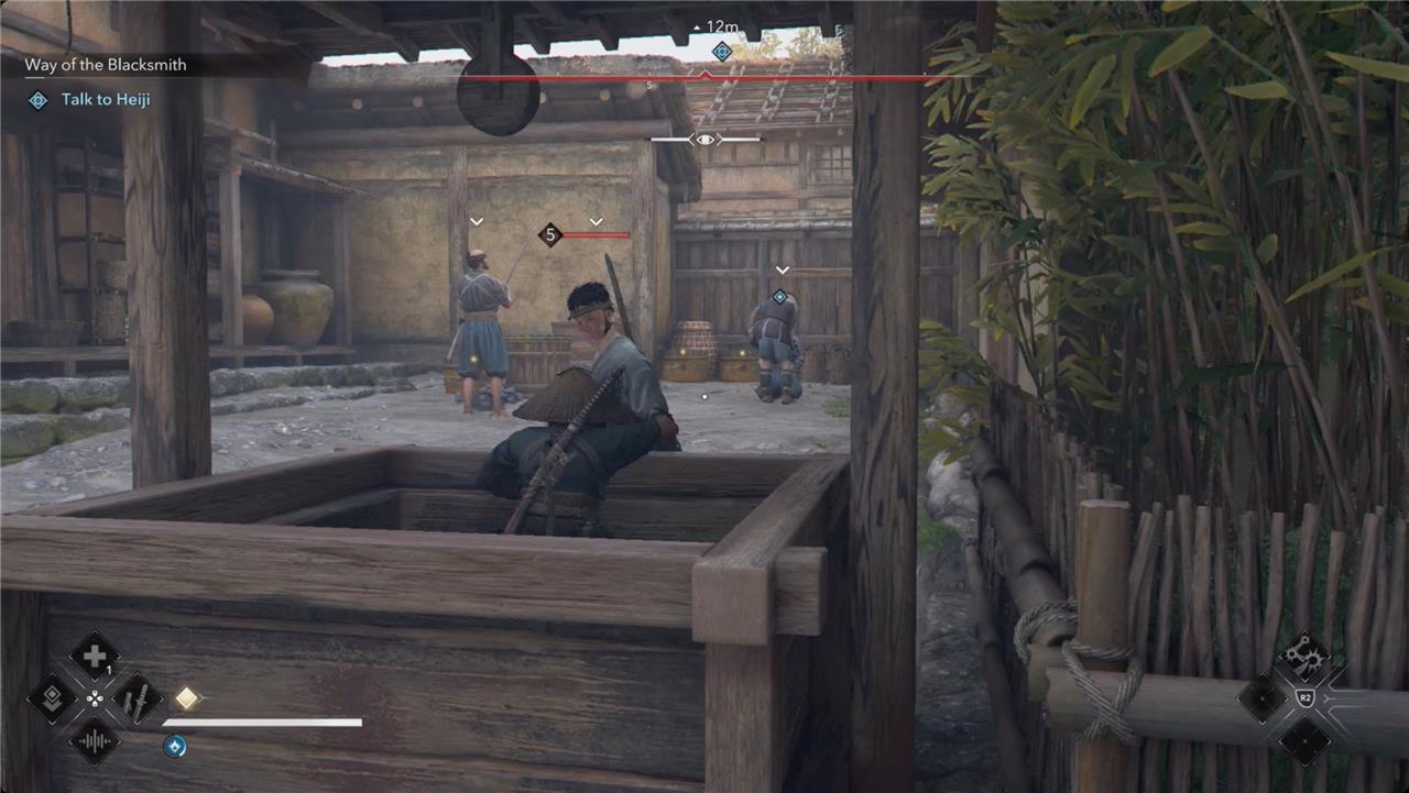Once up there, you’ll find Heiji in a small courtyard west of the street. Observe (L2/LT by default) to focus and look for his blue marker. There will be a bunch of resources (yellow dots) around him along with four thugs (white dots).