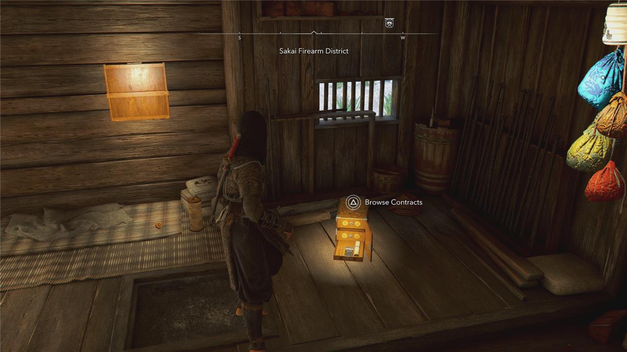 At a kakurega – like the Kakurega room you built at the Hideout or the Sakai kakurega you can unlock for 800 mon – you can take on contracts. One of these will be a liberate cargo contract that sees you looting some military supplies. Those contracts will always get you a ton of resources for very little work (stabbing).