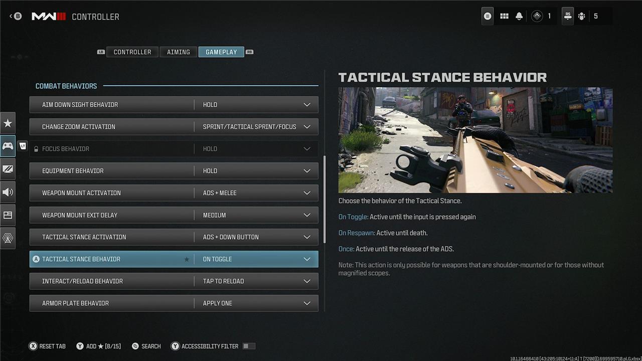 How to enable Tactical Stance and change Tactical Stance controls in MW3 can be done in the settings menu. By default, Tactical Stance is always active in MW3 and can be used by pressing ADS + Melee, which is right click + V on a keyboard, or LT + down on a controller. To change the controls, go to the Gameplay tab in settings, then alter Tactical Stance Activation and Tactical Stance Behavior to your preferred configuration. Available options include turning Tactical Stance off, ADS + Armor, ADS + Alt Fire, a custom input, or double tapping ADS.