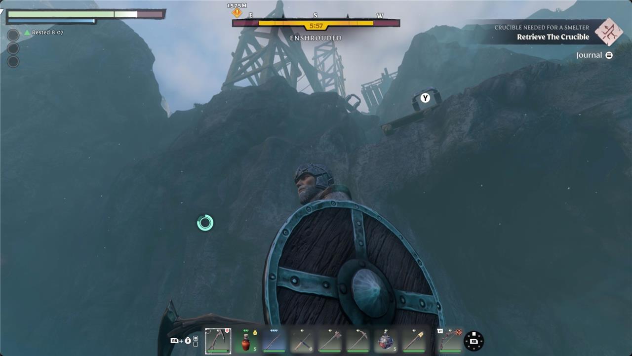 When you’re ready to leave, head south along the valley wall. You’ll find a structure there with two grappling hook points. Keep climbing up until you’re back out of the Shroud and can fast travel away.