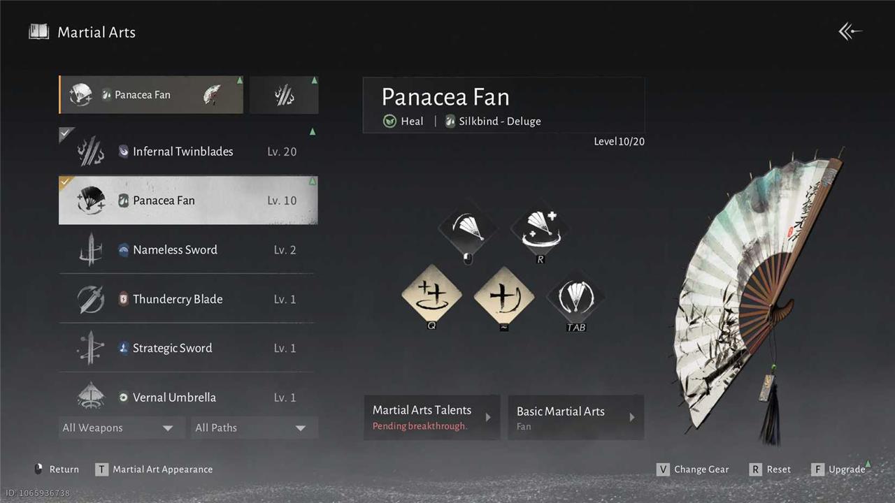 Panacea Fan: A fan martial art focused on healing and support that can keep you topped up in longer fights, best paired with a more offensive main weapon.โ