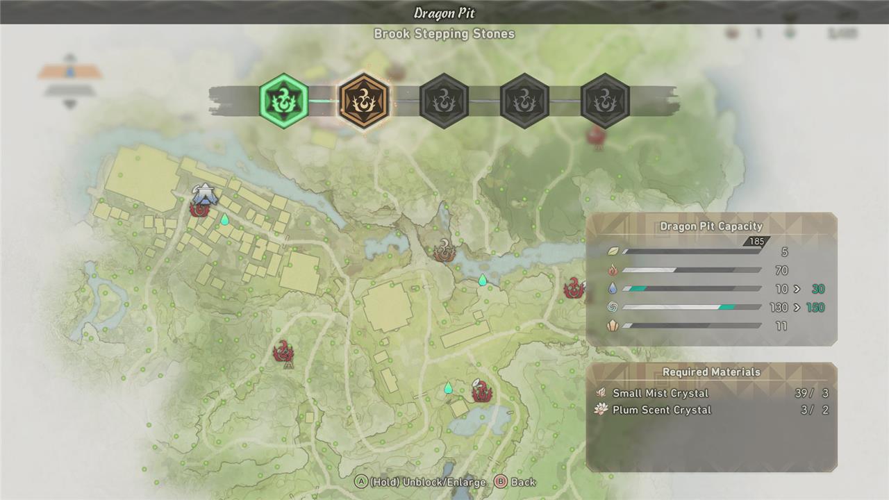 Approach a gray Dragon Pit icon on the map and interact to unblock it with local materials, such as 3 Small Mist Crystals and 1 Small Plum Scent Crystal at Giant Tree Trunk Camp. This adds base energy pools specific to the pit’s region and type.