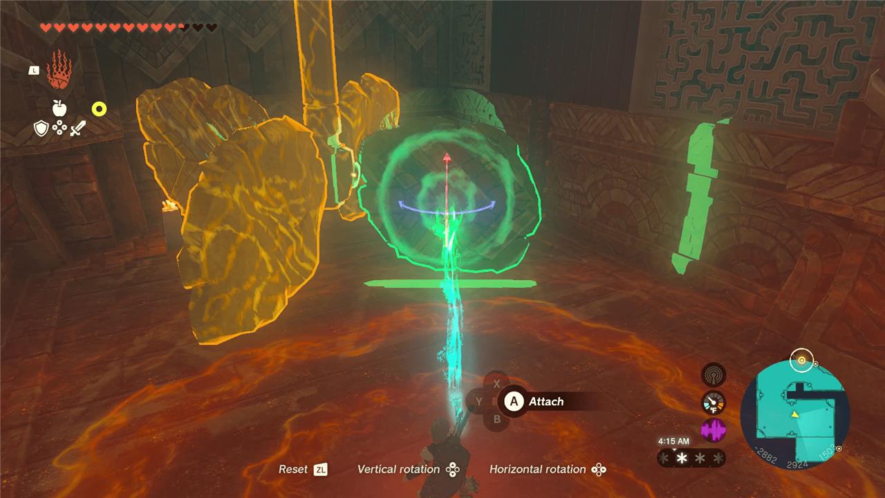 Turn around and take out the Keese. Use Recall on the wheel to reverse it, allowing you to get on the other side. Fight the Construct and use Ultrahand on the lever to open the door, but don’t leave the room yet.