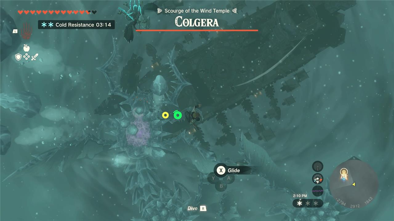 After a bit, Colgera will fire the spikes on its top side, so you’ll have to glide and dodge them. You can use Tulin’s wind gust to help you dodge these spikes. Once the spikes are done, this will leave its top side open for more ice-breaking arrows.