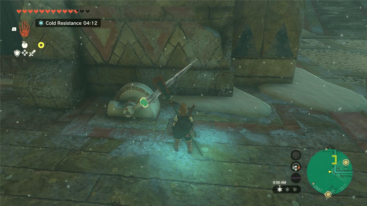 Across this room to the east is another door with a lever, though the lever is broken. Use Ultrahand to fuse a nearby icicle to the broken lever, like so: