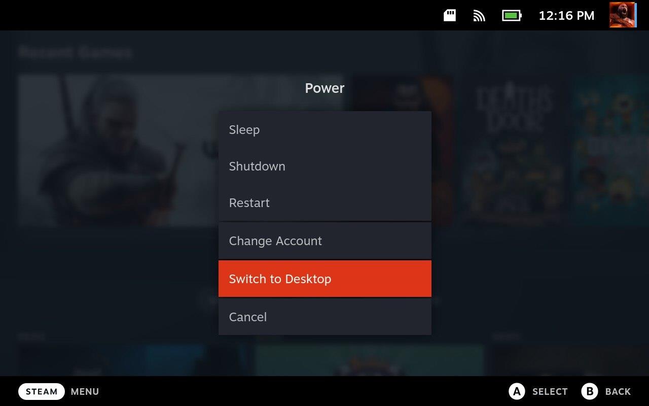 Switch your Steam Deck to desktop mode by hitting the Steam button, selecting Power, and then hitting Switch to Desktop. This will launch a desktop version of the SteamOS.