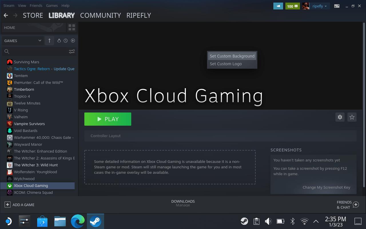 Back in the Steam Library, click on the Xbox Cloud Gaming entry to open it. Right-click where a banner image should be and pick Set Custom Background. Pick the Banner image (the wide landscape one).