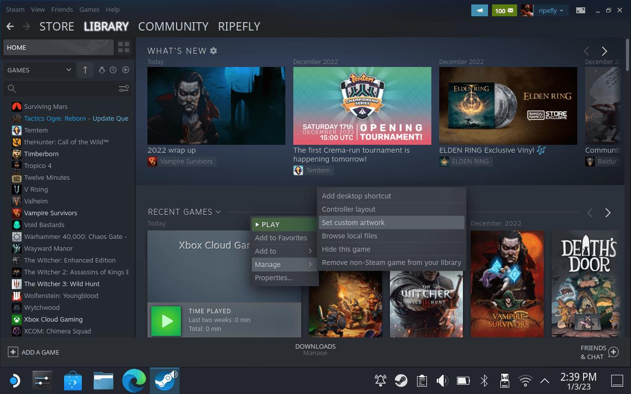 While still in Desktop mode, launch Steam. Scroll through your Library to find Microsoft Edge. Right-click and select Properties.
