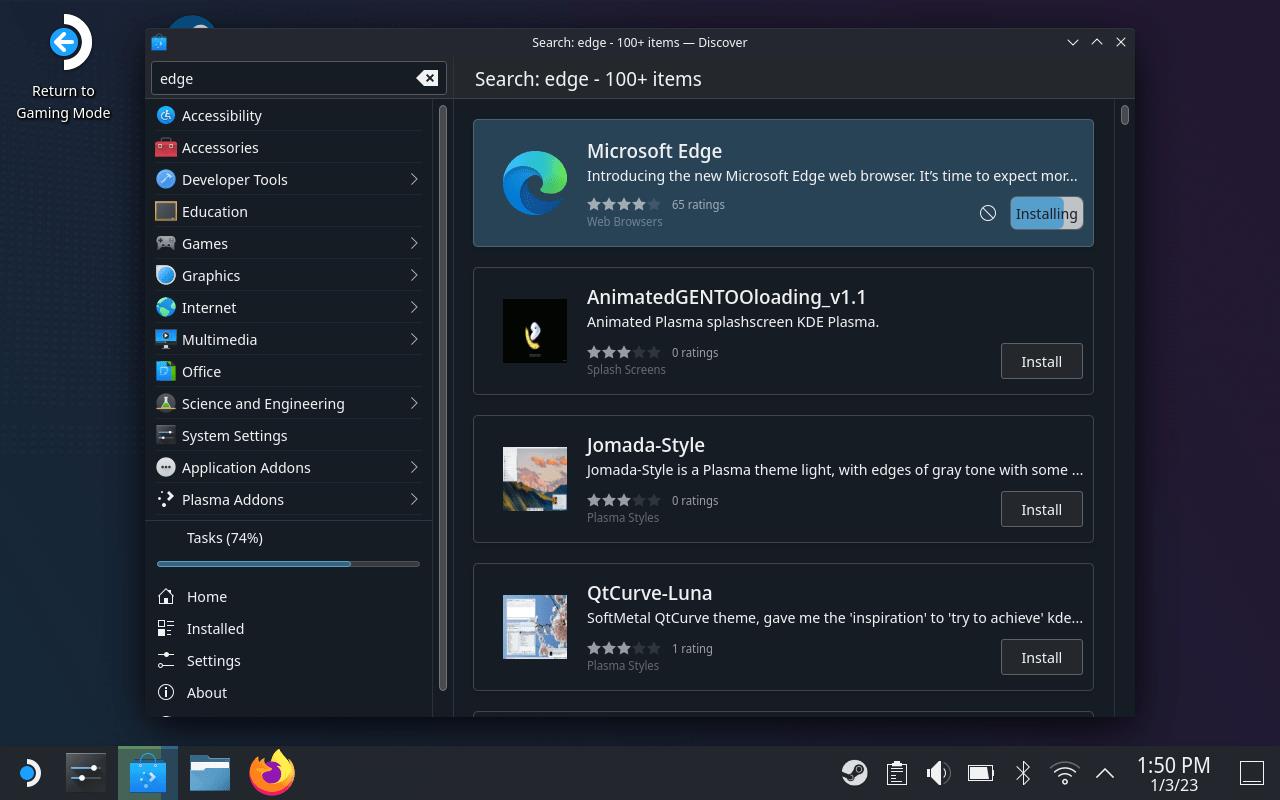 Go down to the menu bar and click on Discover – the icon that looks like a shopping bag. You’ll need to type in the search bar, so click inside it and then hit Steam X to pull up the onscreen keyboard. Type in “edge” (or “Microsoft Edge” if you’re feeling extra) and hit install on the Microsoft Edge browser.