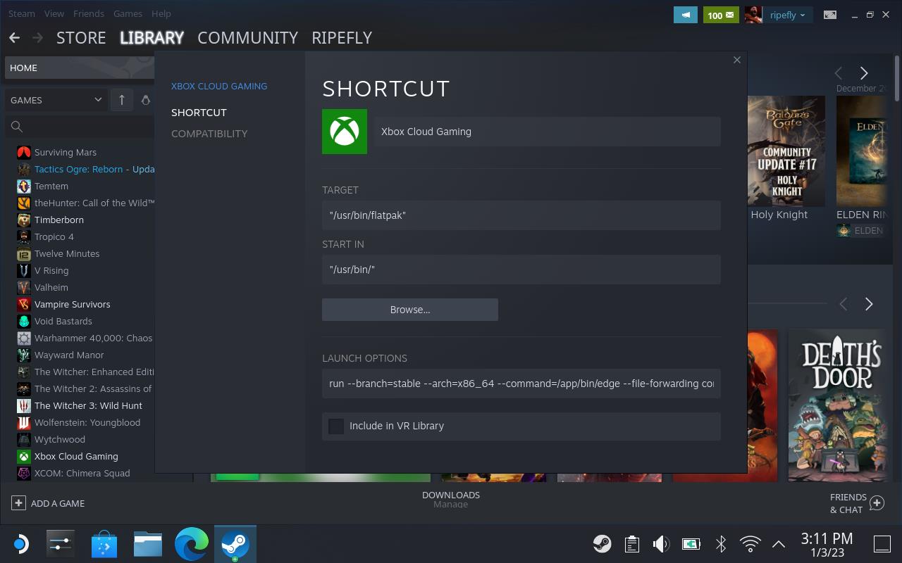 You don’t have to change the name, but it’ll make your life easier if you do – we went with the simple “Xbox Cloud Gaming.” Scroll down to the Launch Options box. There’s already a lot of information there. Click in the box and type in the following at the end of the line after the “@@u @@” part: