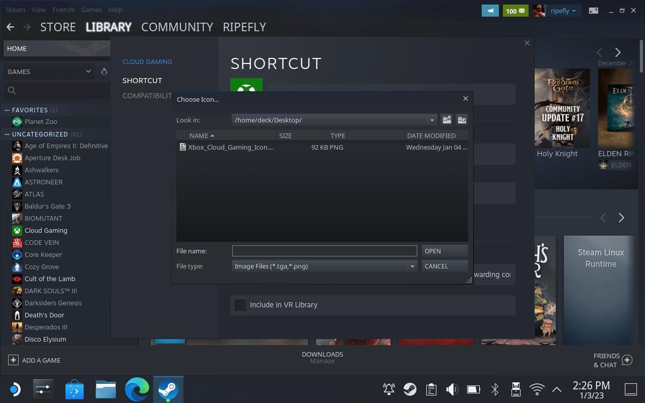 From the Steam Library, open the Properties for Xbox Cloud Gaming (or whatever you named it) again. Click in the empty square next to the name and navigate to wherever you dropped the file – placing it on the desktop puts it at /home/deck/Desktop/. You’re looking for the square one that ends with Icon.