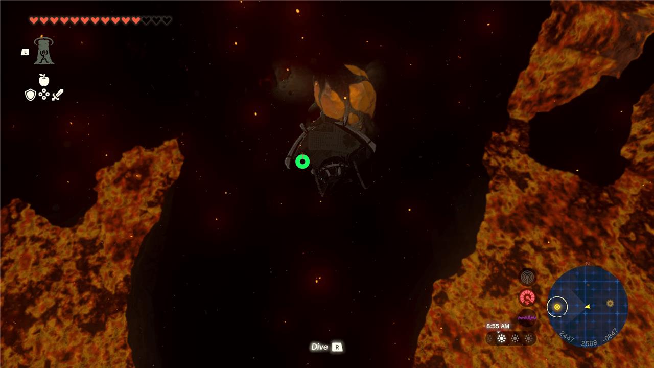 Head north from the Southern Mine through the tunnel to enter Death Mountain Chasm. Glide down carefully while avoiding gusts that push you off course, then land on solid platforms below. Fight off waves of fire enemies using Yunobo’s rolling charge to clear paths. Proceed across lava flows by timing jumps onto safe rock islands, and watch for the chasm’s heat damaging your gear-use fireproof elixirs if needed. Exit at the bottom to reach the next quest marker.