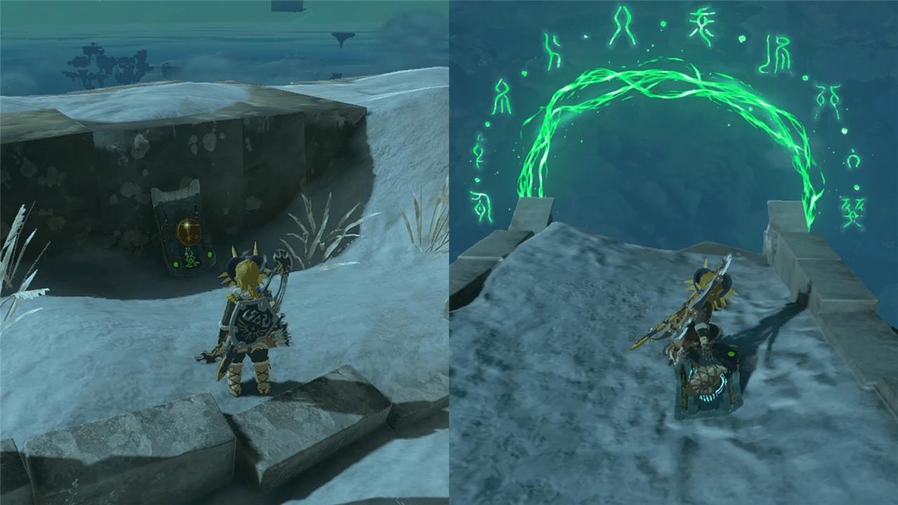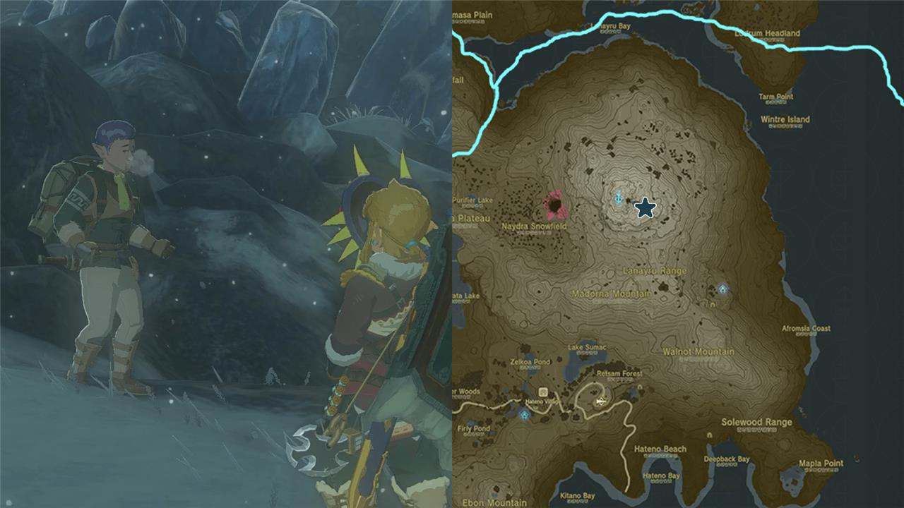Zakusu Shrine is located in the snowy mountains of the Hebra region, northeast of Mount Lanayru. You can find it near the top of Mount Lanayru, accessible through the Rospro Pass region. Because of the freezing temperatures, bring cold-resistant armor or food to survive the harsh weather. Climbing is required to reach the shrine’s elevated location, so stamina-boosting meals or elixirs are helpful for the ascent.