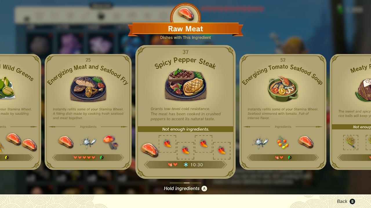 - Recipe ingredients: The base ingredients are any meat and at least one Hylian rice