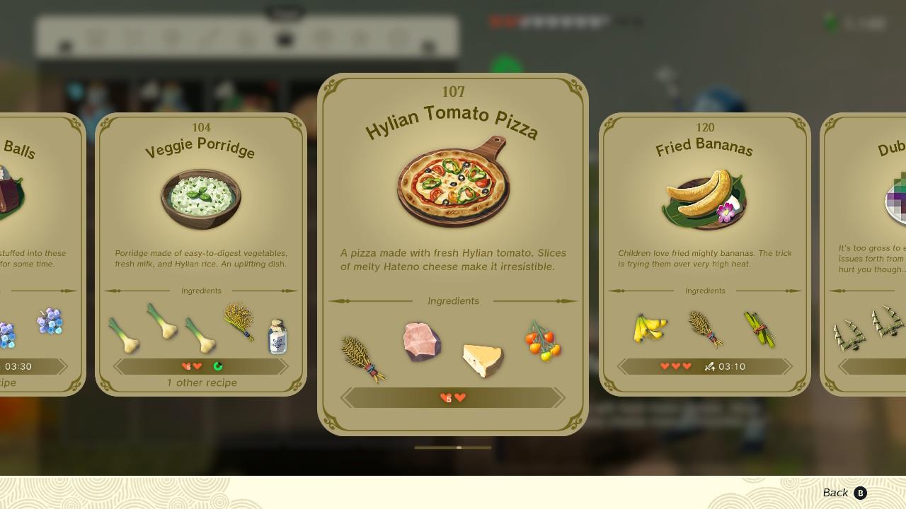 By default, eating a Hylian Tomato Pizza will only replenish hearts. That being said, there’s room for at least one ingredient that can add a specific buff – endura carrots to add temporary stamina, sundelions to heal gloom-afflicted hearts, and so on.